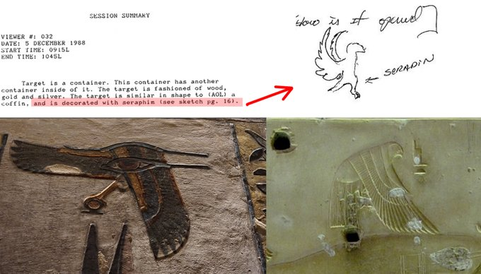 リモート・ビューアーは、ターゲットを木、金、銀でできた棺で、ケルビムではなくセラフで装飾されていると描写しています。