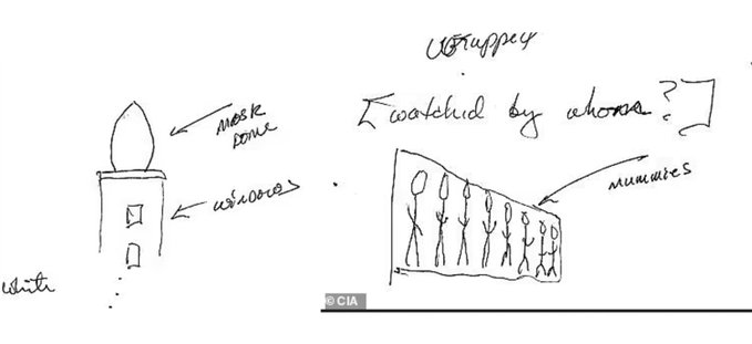 古代エジプトとのもう一つのつながりは、リモート・ビューアーが箱舟の近くに8体のミイラが置かれた壁について説明していることです。箱舟の場所は、地下深くにあり、警備されていると説明されていることから、中東かアラビア半島にあるようです。また、近くに白いモスクがあり、アラビア語が話され、首長が着るような白いローブを着た人々がいるとも述べています。