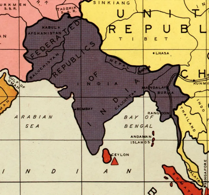 - インド連邦共和国(FRI):現在のアフガニスタン、パキスタン、インド、ネパール、ブータン、バングラデシュ、ビルマ(ミャンマー)。
