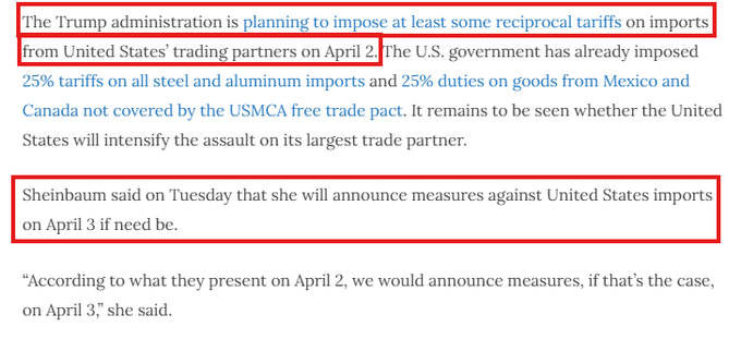 メキシコのシェインバウム大統領はすでに、4月3日に反関税を発表すると宣言しています。