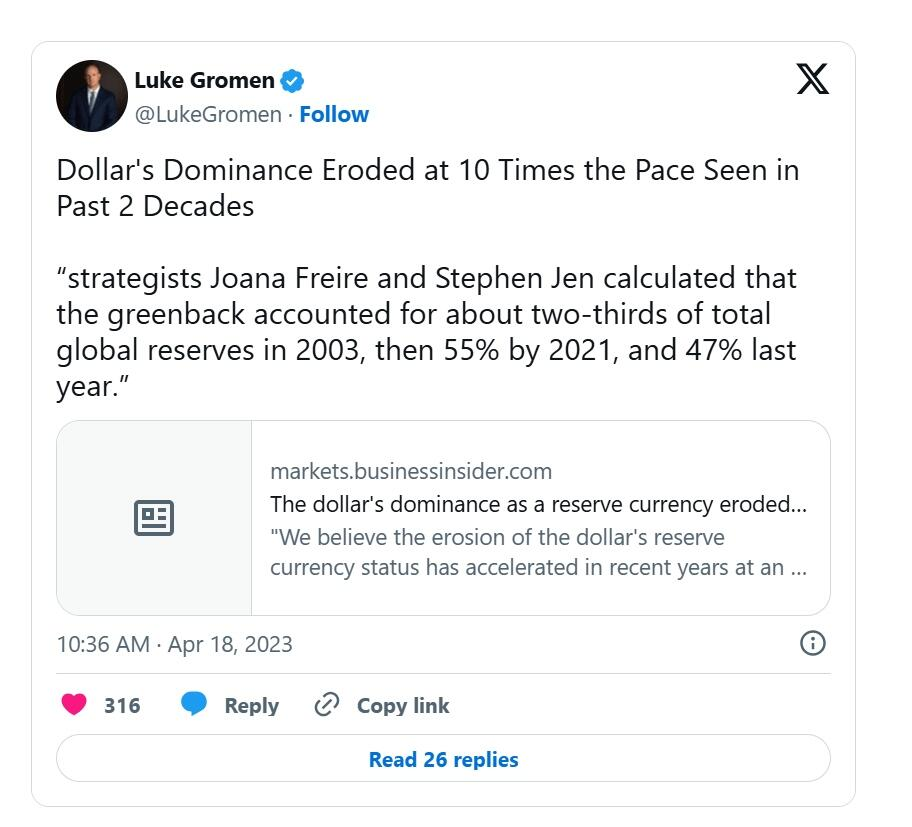 「ストラテジストのジョアナ・フレイレ氏とスティーブン・ジェン氏は、2003年には世界の総準備高の約3分の2を米ドルが占めていたが、2021年には55%、そして昨年は47%にまで減少したと計算しています。」