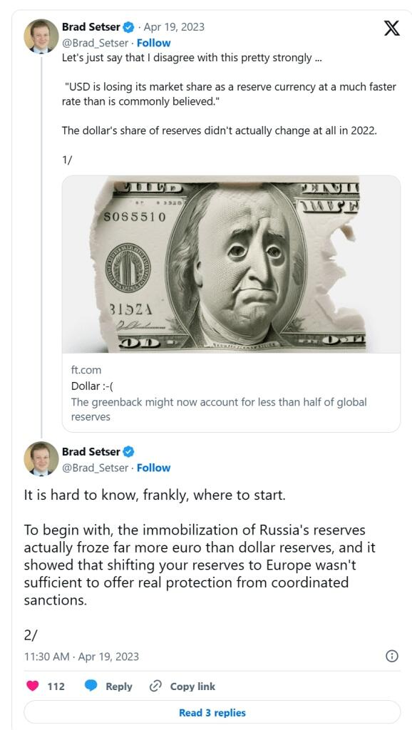 Setser「2022年には、ドルの準備高の割合は実際にはまったく変化していません。」
