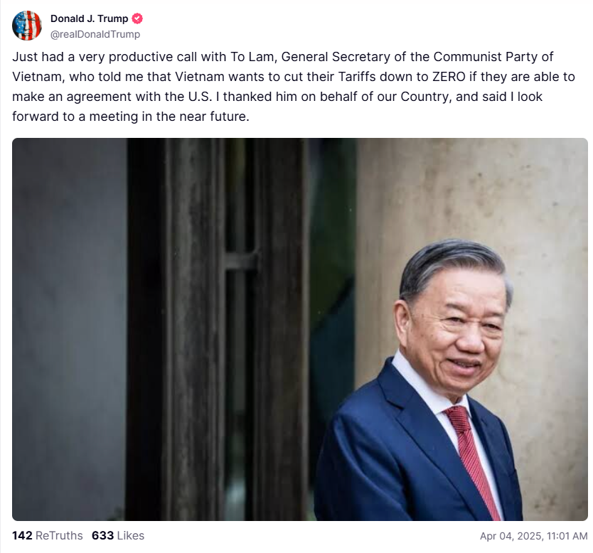 そして、まさにそのことを鮮やかに思い起こさせる出来事が、つい先ほどありました。トランプ大統領が自身のTruth Socialのアカウントで、ベトナム共産党のトップと「非常に生産的な」電話会談を行ったと発表し、ベトナムが関税を「ゼロ」に引き下げたいのであれば、彼らが行うべきことは「米国と合意すること」だけだと付け加えたのです。