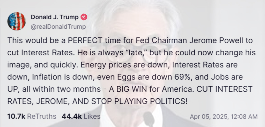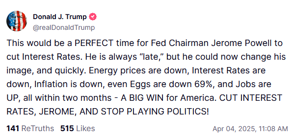 しかし、まだ続きがあります。なぜなら、間もなくパウエルFRB議長が演説を行う予定であるためです。その後のTSへの投稿で、大統領は「これはパウエルFRB議長が金利を引き下げるのに完璧なタイミングだ。彼はいつも“遅れて”いるが、今こそそのイメージを覆し、素早く行動すべきだ。エネルギー価格は下落し、金利も下落し、インフレも下落し、卵でさえ69%も下落し、雇用は増加しています。すべて2か月以内にです。アメリカにとって大きな勝利です。金利を引き下げろ、ジェローム!政治的な駆け引きはやめろ!