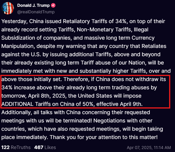 中国が4月8日までに34%の関税を撤廃しなければ、さらに50%の関税を課すと発表したのです。