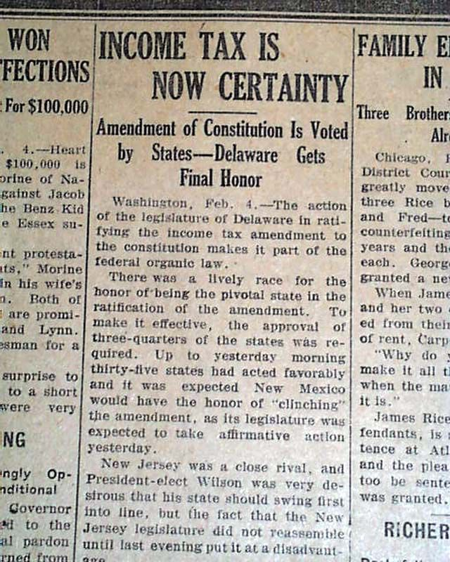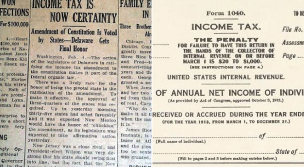 米国憲法は、人口を基準に各州に配分することなく、連邦議会が所得税を課すことを認めています。これは、1895年の最高裁判例であるポロック対ファーマーズ・ローン・アンド・トラスト・カンパニー事件を受けて、1909年に連邦議会で可決されました。1913年2月3日、必要な数の州によって批准された第16条は、事実上、ポロック事件における最高裁の判決を覆しました。