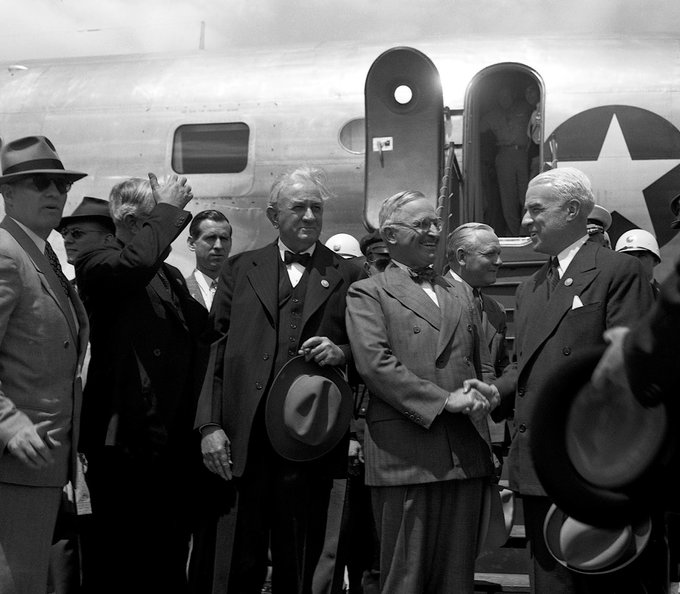 サンフランシスコ空港で、米国大統領ハリー・S・トゥルーマンは、米国代表団のメンバーであるエドワード・R・ステッティニアス・ジュニアとトム・コナリー上院議員に迎えられました。