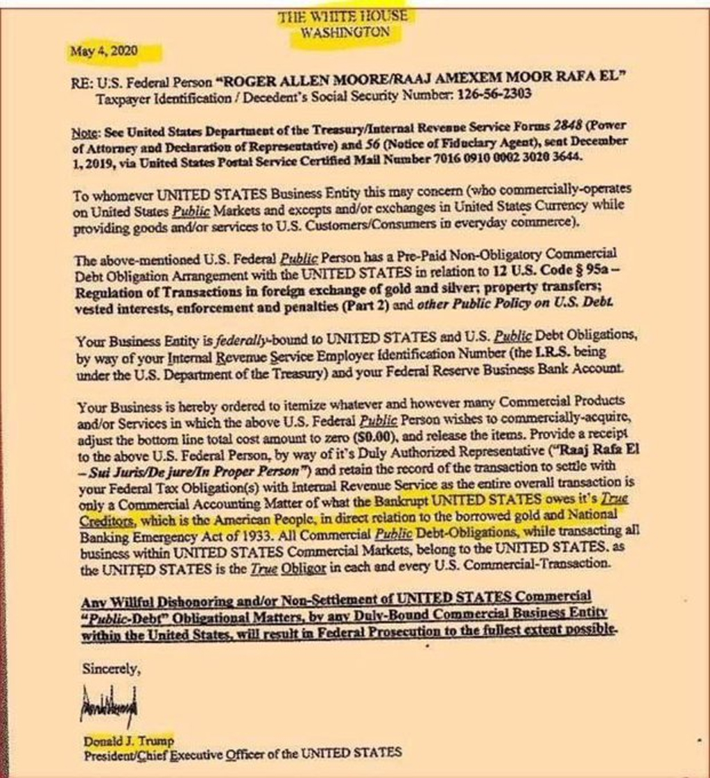 RE: 米国連邦人物「RE: U:S. Federal Person “ROGER ALLEN MOORE / RAAJ AMEXEM MOOR RAFA EL」 納税者番号/被相続人の社会保障番号:126-56-2303
