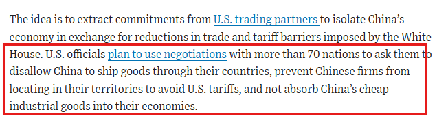 米国当局は、70以上の国々と交渉を行い、中国が自国を経由して商品を輸送することを禁止するよう要請する方針です。