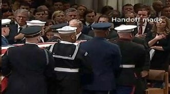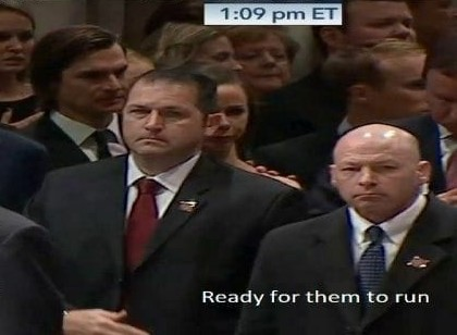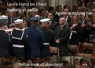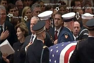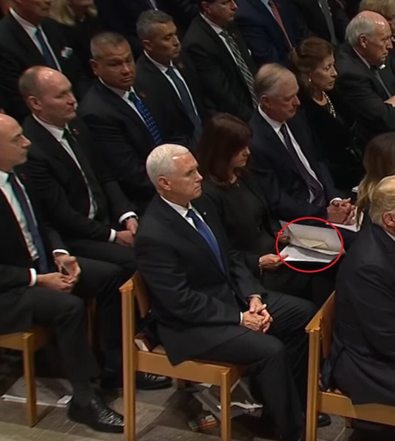 ご覧のとおり、ブッシュの葬儀に出席した他の妻たちと同様、カレン・ペンスもプログラムの中にメモを受け取りました。また、ペンスの後ろ、彼の左側に、副大統領が大統領のすぐ後ろに座っている間、シークレット・サービスのエージェントが彼の反応を監視していることにご注目ください。