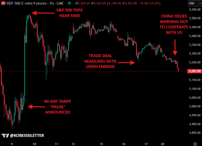 S&P 500は、90日間の関税「一時停止」後の4月9日の最高値から、現在2.5兆ドル下落しています。
