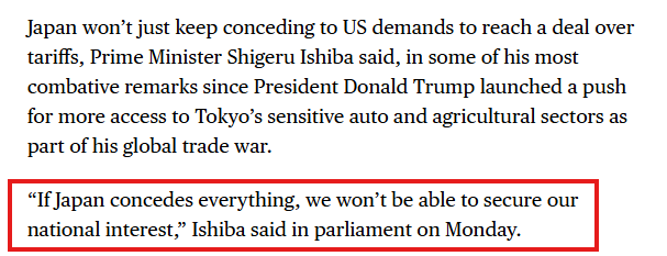 ブルームバーグは、日本の首相が、米国の関税交渉においてこれ以上譲歩はしないと述べたと報じました。