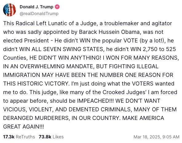 トランプ大統領の2期目の最も重要な政策のひとつは、1798年の敵国外国人法を活用して、ベネズエラのギャング「トレン・デ・アラグア」のメンバーとされる者たちを標的にしたことでしょう。これは、トランプ大統領が裁判官を批判したもうひとつの事例でもあります。