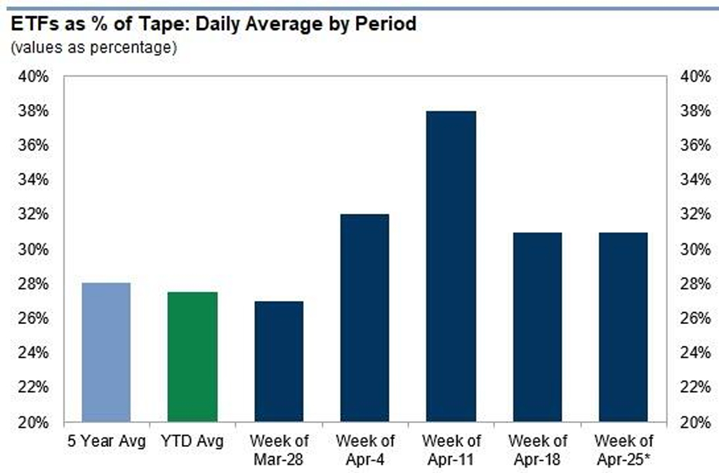 昨日の株式市場の急騰の中で、ETFは全体の取引高の34%を占めました(年初来平均は28%)。これは、国内、海外、セクターのエクスポージャーの組み合わせにより、デスクが買いに傾いたためです。