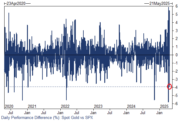 Goldman ETFのスペシャリスト、クリス・ルカス氏は、ここ数週間、Goldmanでは、幅広い顧客層から、スポット・エクスポージャー(GLD)の需要が高まっていると述べています。これは、全般的なアウトパフォーマンスと、不確実性を管理するための手段としての役割が要因です。しかし、S&Pが過去2年間で3番目の好成績を記録した後、昨日の価格の動きは、その反動によるものと思われます。