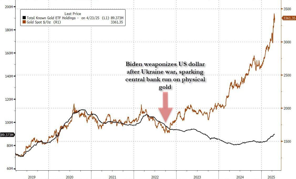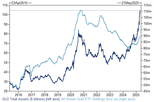 ETFの急落は、現物ではなくペーパーを使って金価格を動かすことがいかに容易であるかを示していますが、このような売りは一時的なものにとどまる可能性も示唆しています。Goldmanが指摘するように、金ETFの運用資産は過去最高水準にあるものの、ETFが保有する金の総量は2020年の水準を下回っています。GLDの記録的なAUMは、価格上昇が新規投資を上回った結果の産物です(ただし、年間を通じて資金流入は堅調でした)。