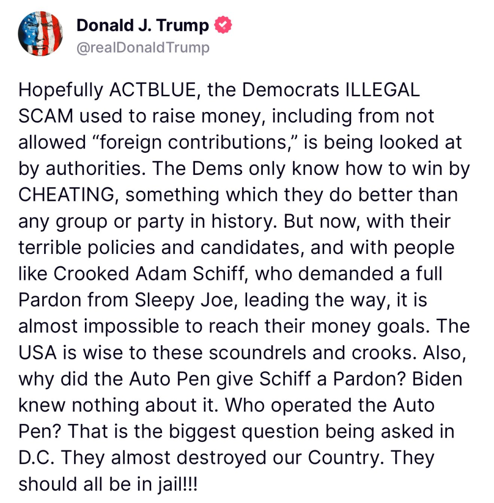 腐敗した体制の基盤を揺るがす動きとして、ドナルド・J・トランプ大統領は、政治資金調達を装った、史上最も卑劣なマネーロンダリング操作であるActBlueに対して、ついに正義の火を放ちました。