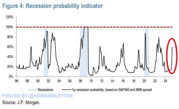 S&P 500の収益率およびBBB格付けの社債スプレッドから算出した1年後の景気後退確率は急上昇しています。