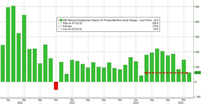 ADPによると、4月の米国の雇用者数は62,000人増にとどまり、2024年7月以来の最低水準となりました。