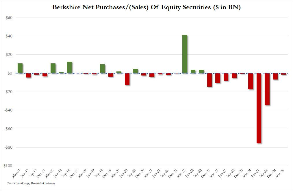 一方、Berkshireは10四半期連続で株式の純売却を続けていますが、そのペースは大幅に鈍化し、純売却額は15億米ドルにとどまり、第4四半期の67億米ドル、2024年第2四半期の過去最高の755億米ドルから大幅に減少しています。