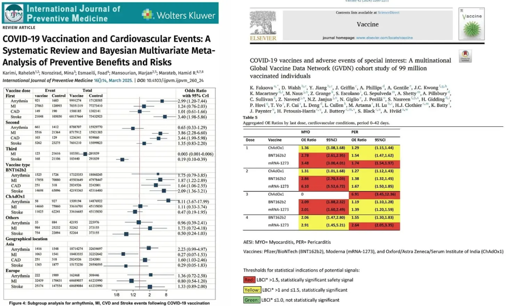 9,900万人(Faksova et al)および8,500万人(Raheleh et al)を対象にした、これまで実施された2つの最大規模のCOVID-19ワクチン安全性研究では、mRNA注射は人間への使用には安全ではないことが明らかになりました。この注射は、以下の重篤な有害事象のリスクを大幅に高めます。
