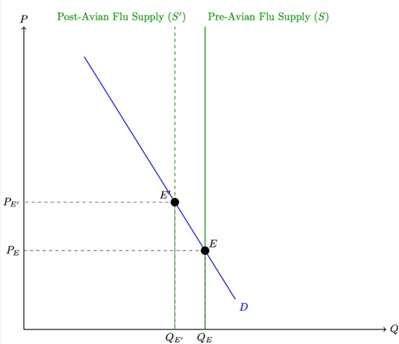 物語が整ったところで、市場の反応を理解し始めることができます。需要と供給に関する基本的な経済学の原理によると、他の条件が同じであれば、供給が減少して需要が一定の場合、価格は上昇します。卵は需要の弾力性が比較的低いため、供給のわずかな変化でも大きな影響を及ぼす可能性があります。農業経済学者ジェイソン・ラスク氏によると、卵はこうした商品の1つです。卵の弾力性は、一般的に-0.15%と想定されています。卵は、代替品がほとんどない商品であり、一般的に家庭の主食とみなされています。したがって、ブライアン・アルブレヒト氏が示すように、