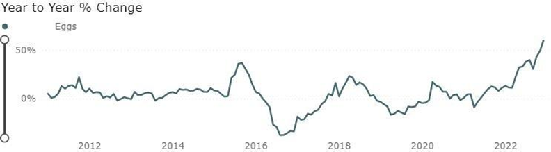 鳥インフルエンザの結果として生じたこの供給のシフトは、2022年以降1億3000万羽以上の家禽が失われたという、決して小さな縮小ではありませんでした。したがって、市場調整の結果として卵価格が上昇しているならば、この大規模な供給ショックと一致する前年比の価格変動が見られるはずです。これは、Luskが示すデータによって裏付けられています。