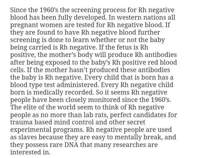 1960年代以降、Rh陰性血液のスクリーニング検査は完全に確立されました。西洋諸国では、すべての妊婦がRh陰性血液の検査を受けます。Rh陰性血液と判明した場合、さらに検査を行い、胎児がRh陰性であるかどうかを確認します。胎児がRh陽性の場合、母親の体は胎児のRh陽性赤血球に接触するとRh抗体を産生します。母親がこれらの抗体を産生していない場合、赤ちゃんはRh陰性となります。生まれた子供全員に血液型検査が行われます。Rh陰性の子供たちは、すべて医療記録に残されます。したがって、1960年代以降、Rh陰性者は厳重に監視されているようです。世界のエリートたちは、Rh陰性者を実験用ネズミに過ぎない、トラウマに基づくマインド・コントロールやその他の秘密の実験プログラムに最適な候補者だと考えているようです。Rh陰性者は、精神的に壊れやすく、多くの研究者が興味を持つ希少なDNAを保有しているため、奴隷として利用されています。