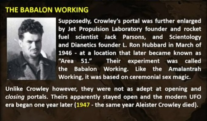 ジェット推進研究所の創設者ジャック・パーソンズとサイエントロジーの創設者L.ロン・ハバードは、クロウリーのポータルをさらに発展させましたが、それを閉じる技術にはクロウリーほど熟練しておらず、1947年、クロウリーが死去した年に現代のUFO時代が始まりました。
