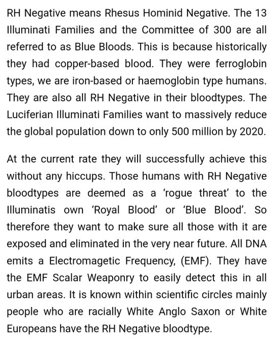 RH陰性とは、レズス・ホミニド陰性を意味します。13のイルミナティ家族と300人委員会はすべて「ブルーブラッド」と呼ばれています。これは、歴史的に彼らが銅を基にした血液を持っていたためです。彼らはフェログロビン型で、私たちは鉄を基にしたヘモグロビン型の人間です。また、彼らの血液型はすべてRH陰性です。ルシファー派イルミナティの家族は、2020年までに世界人口を5億人にまで大幅に削減することを目指しています。