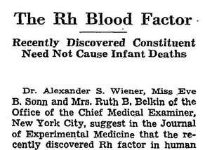 ニューヨーク市首席監察医事務所のアレクサンダー・S・ウィーナー博士、イブ・B・ソン氏、ルース・B・ベルキン夫人は、Journal of Experimental Medicine誌で、最近発見された人間の Rh因子は、乳児死亡の原因ではないことを示唆しています。