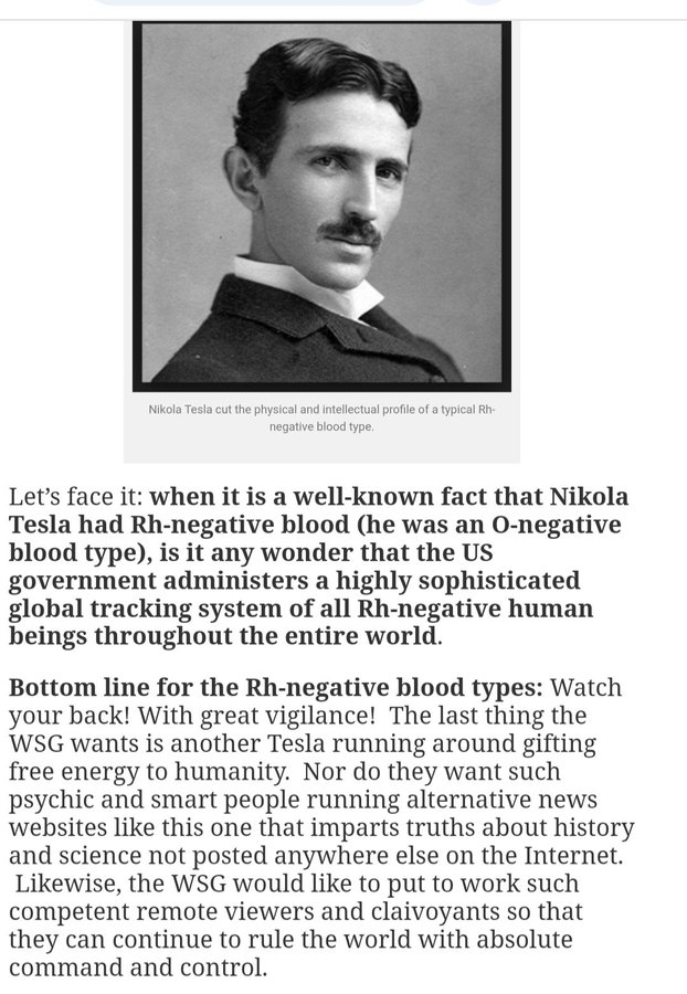 Rh陰性の人たちにとって重要なことは、背後に注意し、警戒を怠らないことです。WSGが最も望まないことは、人類にフリーエネルギーを贈るテスラのような人物が現れることです。また、インターネット上の他のどこにも掲載されていない、歴史や科学に関する真実を伝える、このようなオルタナティブなニュースウェブサイトを運営するような、超能力や知性を持つ人物も望んでいません。同様に、WSGは、そのような有能なリモート・ビューアーや透視能力者を働かせて、絶対的な支配と統制の下で世界を引き続き支配したいと考えています。