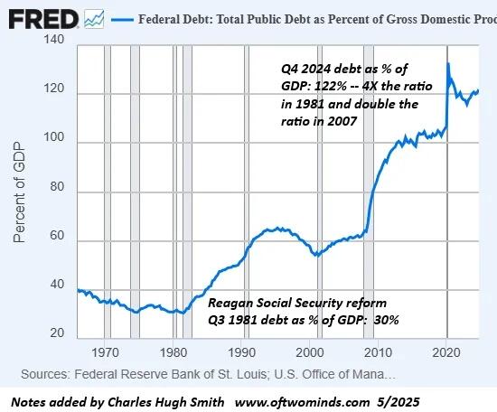 擁護者たちは、この債務をインフレや「成長」のせいにしたがりますが、それは誤った方向への誘導です。国のGDP(国内総生産)に占める債務の割合は、1980年代初めにレーガン大統領が社会保障制度改革を推進して以来、4倍に増加しており、FRBがハイパー金融化によって現状を救済する前の2007年以降、GDPに占める割合は2倍になっています。