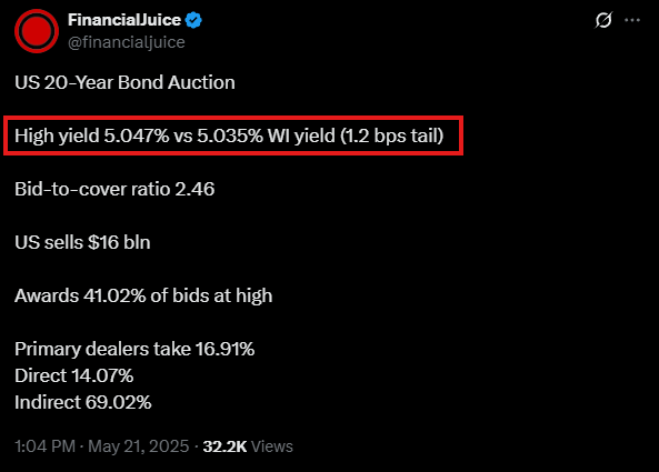 本日、米国は20年物債券160億ドルのオークションを実施しました。