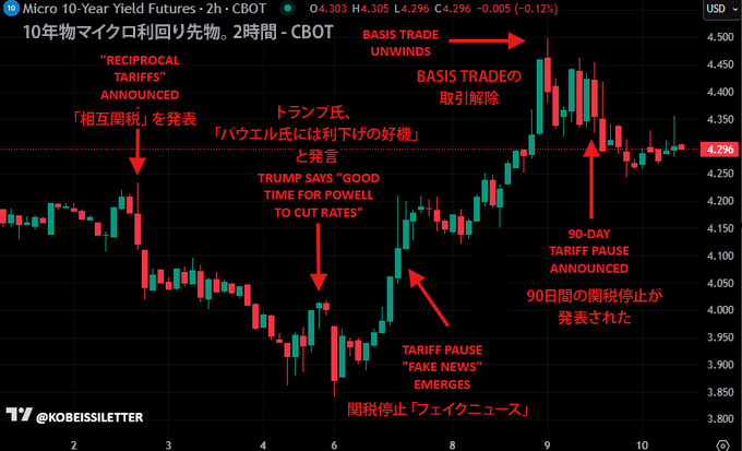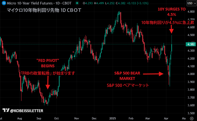 4月2日の「相互関税」導入以前は、10年物国債利回りは直線的に低下していました。