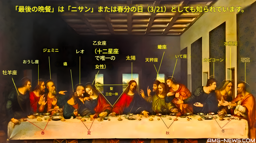 さらに、ダ・ヴィンチが弟子たちを4つの季節ごとにグループ分けしていることもわかります。12星座の真ん中にいるイエスは、太陽を表しています。