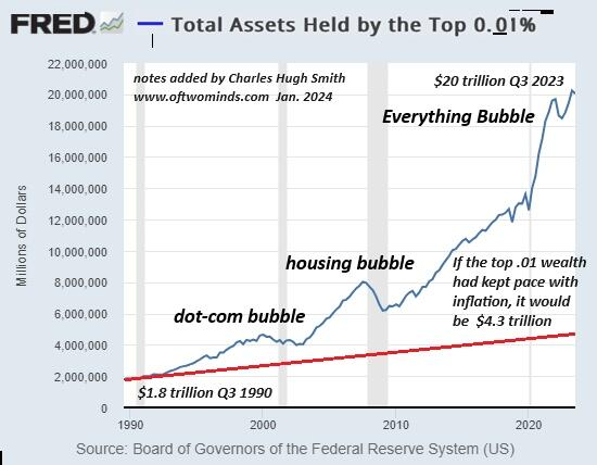 現状維持の最後の切り札は、すべての人に無限の富の幻想を生み出す信用資産バブルです。もちろん、資産を所有する人々は富を手に入れ、その下の人々は「トリクルダウン」効果によって富を分け合うことになります。つまり、あなたが100万ドルの別荘を購入すると、私は駐車場に車を停めて、街で働きながら車の中で暮らすことになるのです。