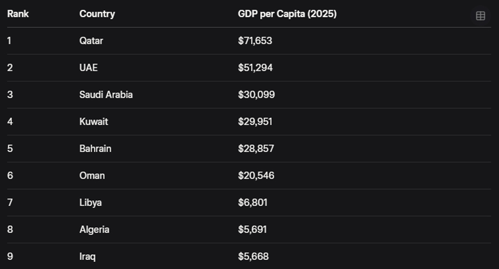 ➡️ 1人当たり$5,668 — カタール($71,653)やアラブ首長国連邦($51,294)に大きく後れを取っています