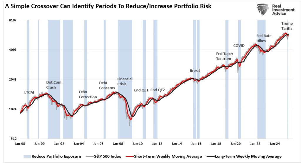 短期移動平均が長期移動平均を下回ると、「売りシグナル」が発生します。このトリガーは、投資家がポートフォリオの株式リスクを削減すべきであることを示唆しています。そのシグナルが逆転したら、投資家は株式リスクを増やすべきです。1995年以降、この週次指標が「誤った」シグナルを発したことは3回のみです。しかし、そのシグナルは強気相場が続き、すぐに逆転し、投資家のトータル・リターンにほとんど影響を与えませんでした。このシグナルは、投資家に重大な景気後退を警告し、株式エクスポージャーを減らして、より大きな資本破壊を回避するよう促しました。