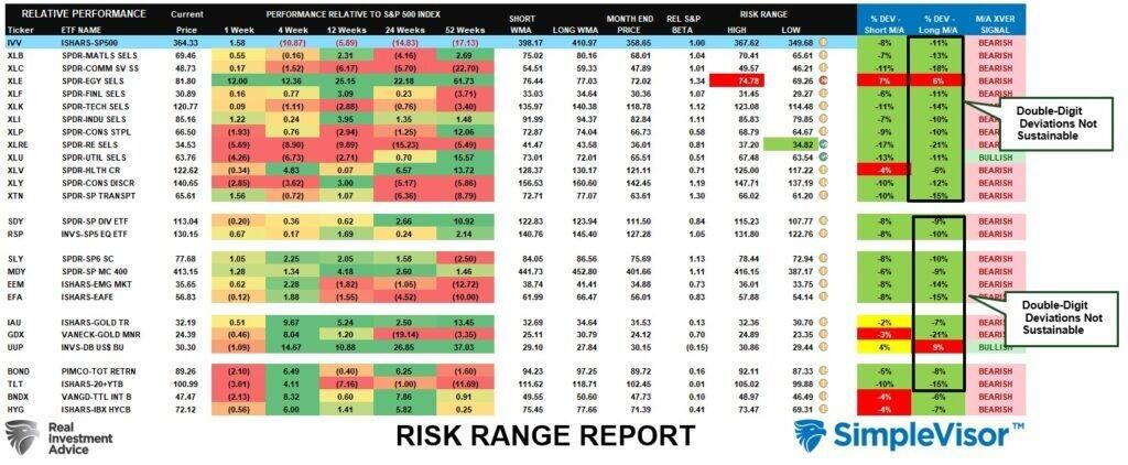 「毎週発行の『リスクレンジレポート』では、投資家が知っておくべき3つの重要な要因について詳しく説明しています。まず、最近の市場暴落により、すべての主要市場およびセクターが通常の月間許容範囲を大幅に下回っています。このようなすべての市場で極端な動きが均一に見られるのは、市場暴落時のみです。次に、長期移動平均からの乖離が2桁に達しています。多くのセクターおよび市場でこのような大きな乖離が見られることも、歴史的に見ても珍しく、平均への強気な反転に先立つ現象です。」