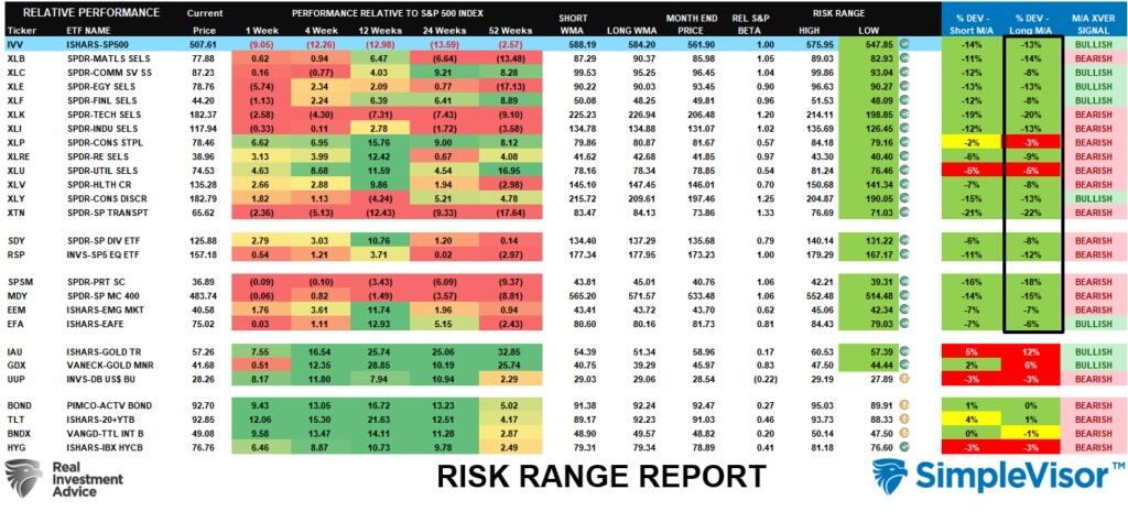 この分析では、右端の列に注目します。上記の例では、2021年11月、すべての主要市場およびセクター(米ドルを除く)が、強気の移動平均のクロスオーバーを示しています。これは週次データであるため、動きは遅く、ポートフォリオのリスクの増加と減少の両方について、より正確なシグナルを提供する傾向があります。