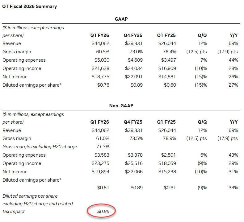 収益面では、NVidiaは、第1四半期にH20の収益25億ドルの追加出荷ができませんでした(同社によれば、新しい輸出許可要件導入前の2026年度第1四半期のH20製品の売上高は46億ドルでした)。45億ドルの費用を除くと、第1四半期の非GAAPベースの1株当たり希薄化後利益は0.96ドルとなったと、同社は述べています。