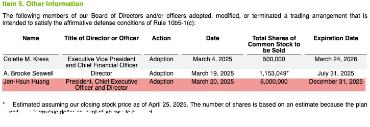 CEOのジェンセン・フアン氏は3月、2025年12月31日までに最大600万株を売却する取引計画を立てました。同提出書類では、取締役のブルック・シーウェルが2025年7月31日に期限切れとなる取引計画に基づき153万株を売却する意向であることも明らかにされました。一方、CFOのコレット・クレスは2026年3月24日までに50万株を売却する計画です。