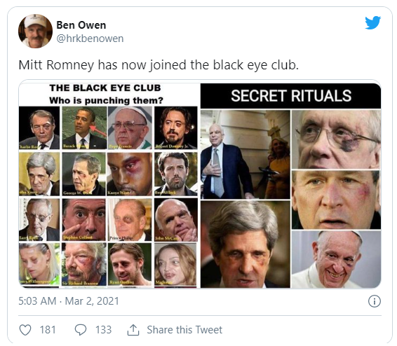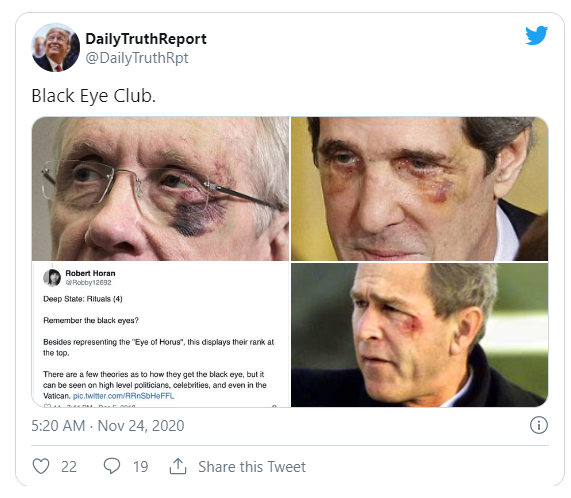 公式な組織ではありませんが、「ブラック・アイ」クラブとは、突然、謎の黒い傷が目の周りにできた政治家、有名人、ビジネス・エリート、国家元首などの人数が増えていることを指します。そのうちのいくつかは右目に傷がありますが、大半は左目です。この現象に見舞われた人物には、ジョージ・ブッシュ、カニエ・ウェスト、ローマ教皇などがいます。
