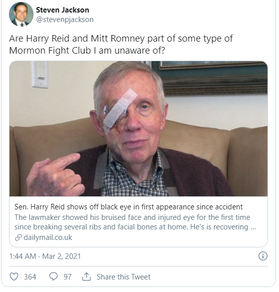 ミット・ロムニー上院議員は、2021年3月1日(月)に「私は転倒して意識を失いましたが、今は元気です」と発言しました。彼は、CPAC大会に出席したために目元を傷つけたと冗談を言いましたが、転倒したのはボストンで孫たちを訪ねていたときで、眉と唇に数針を縫うほどの怪我を負い、目元も打撲傷を負ったと述べています。