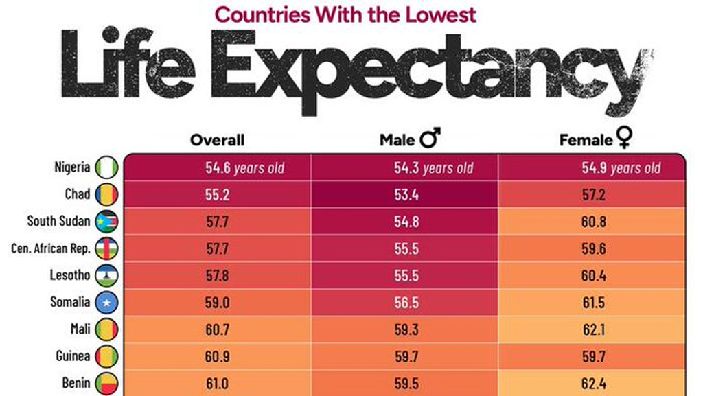 ナイジェリアの平均寿命は 54.6 歳で、最も長寿の国であるモナコよりも約32年も短いです。ナイジェリアはアフリカ最大の経済大国の一つですが、広範囲に蔓延する病気、高い貧困率、十分なインフラの欠如により、平均寿命は短くなっています。