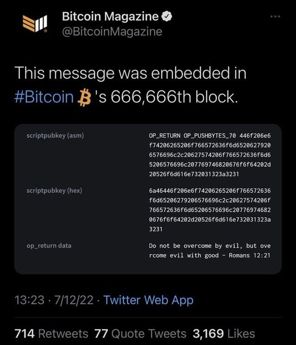 Bitcoinのブロックチェーンの666,666番目のブロックには、聖書の文章が記載されています。