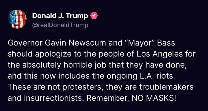 速報:トランプ大統領は、暴動鎮圧法を発動し、ロサンゼルスに数千人の軍隊を派遣して、無政府状態を鎮圧し、覆面をした反逆者を逮捕し、民主党の妨害を排除します。ディープ・ステートのゲームは終了しました。アメリカはトランプ大統領の手に戻りました。