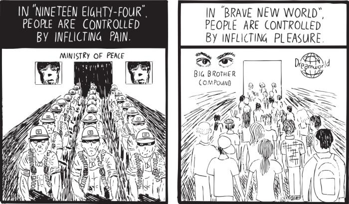 ハクスリーの1932年のディストピア的ビジョンは、オーウェルの1949年のディストピア的ビジョンよりも実現の可能性が高いと考え、1949年にオーウェルに宛てた死の直前の手紙でもその考えを強調しました。このビジョンは、私たちの支配者たちが、思考能力のない大衆の弱点を支配、操作、搾取するために用いてきた主な手法となっています。彼らは市民を快楽で惑わせ、薬物で無気力にさせ、政府が運営する洗脳施設(公立学校)で思考ではなく感情を重視するように教育し、無意味な雑多な情報で過剰に刺激することで、善悪を区別する能力を失わせ、自らの隷属を自由だと信じ込ませています。