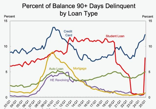 クレジット・カードの負債は1兆3000億ドルと過去最高額に達し、2020年から3500億ドル(35%)増加しました。これらのクレジット・カードの平均残高は7000ドルを超え、未払いの残高に対する平均金利は21%を超えています。学生ローン債務は1.8兆ドルで過去最高を記録し、2020年比で100億ドル増加し、これらのローンの25%以上が債務不履行状態にあります。自動車ローン債務は1.7兆ドルで過去最高を記録し、2020年比で350億ドル(27%)増加しています。これらのローンの平均期間は現在70ヶ月です。借り手は、これらのローンの5年目までに債務超過に陥ります。驚くべきことに、クレジット・カードと自動車ローンの延滞は昨年、急上昇し、クレジット・カードの延滞は2012年以来初めて3%を超え、自動車ローンの延滞は2010年以来初めて8%を超えました。これは、堅実な経済基盤を持つ消費者と言えるでしょうか?
